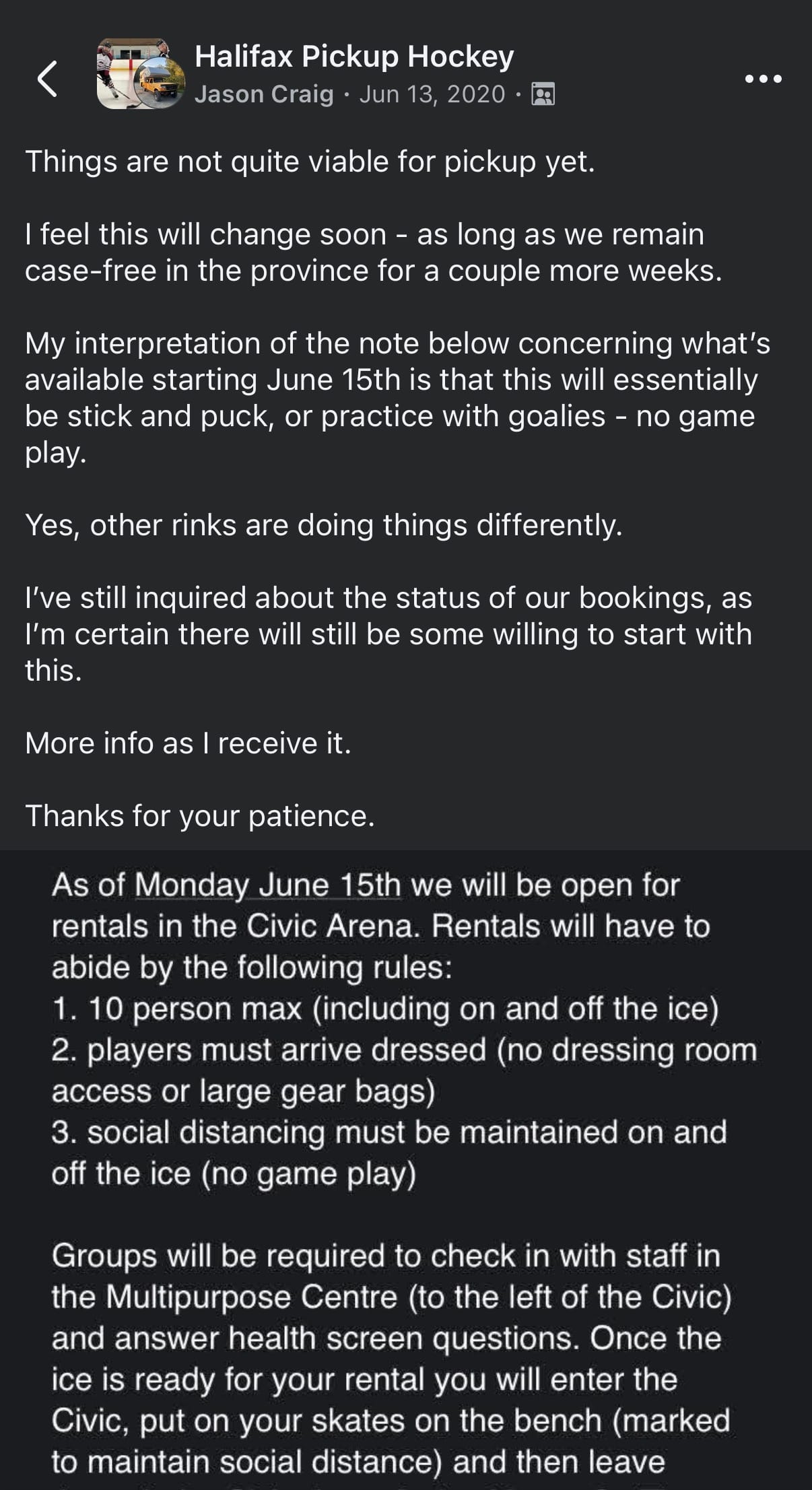 We were doing event posts on a facebook group page leading into the lockdown, but we had to change that approach coming out of the first one. By the middle of June of 2020, with some opening of the rinks and other public spaces on the horizon, we had to make choices. The initial opening at the Halifax Forum, in line with provincial restrictions - was for groups of ten. Ten people on the ice. Two goalies, eight skaters, four on four with no subs.